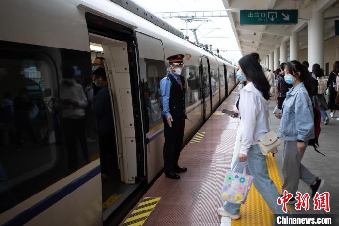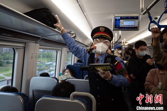 “請(qǐng)保管好自身財(cái)物,看管好小孩,照顧好老人,上下車注意腳下安全?!睌?shù)百名乘客陸續(xù)上車后,鐘靜開始在車廂里巡視。疫情防控期間,他要提醒大家戴好口罩。遇到行李架上行李擺放不規(guī)范,他要?jiǎng)邮终?。同時(shí),他還負(fù)責(zé)整列4節(jié)車廂的查票、補(bǔ)票工作。