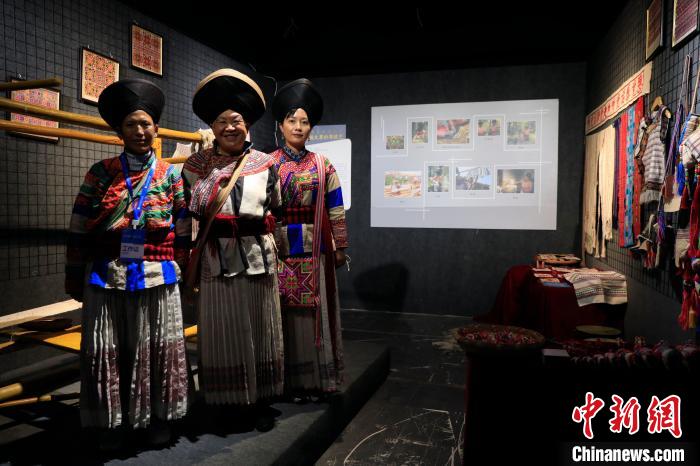 傈僳族火草織布技藝展區(qū),身著火草麻布百褶裙的熊國秀(左二)?!⊥趵?攝