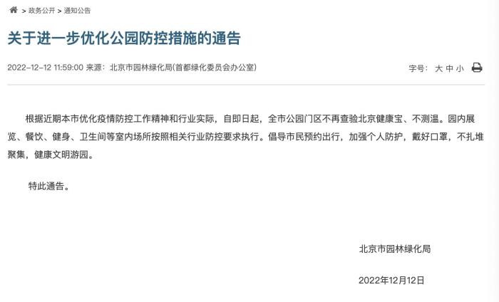 12月12日,北京市園林綠化局發(fā)布關(guān)于進(jìn)一步優(yōu)化公園防控措施的通告。