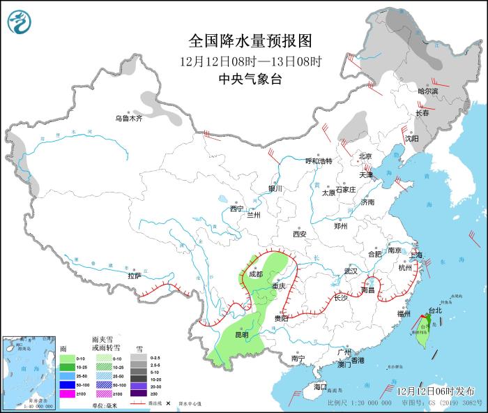 12月12日08時至13日08時,新疆阿勒泰和南疆盆地西部山區(qū)、內蒙古中部和東北部、黑龍江、吉林中東部、遼寧東部等地的部分地區(qū)有小到中雪或雨夾雪。四川東部、云南東部和南部、臺灣島等地的部分地區(qū)有小雨,局地中雨。華北大部、東北地區(qū)大部、河南東部、山東半島等地的部分地區(qū)有4~6級風,其中,內蒙古中西部等地部分地區(qū)有6~7級風(見圖3)。