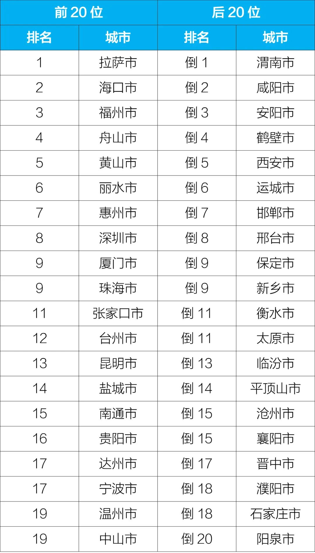 1—11月,168個重點城市中,拉薩、??诤椭凵绞械瘸鞘锌諝赓|(zhì)量相對較好(從第1名至第20名);渭南、荊州和咸陽市等城市空氣質(zhì)量相對較差(從倒數(shù)第1名至倒數(shù)第20名),見附表2。
