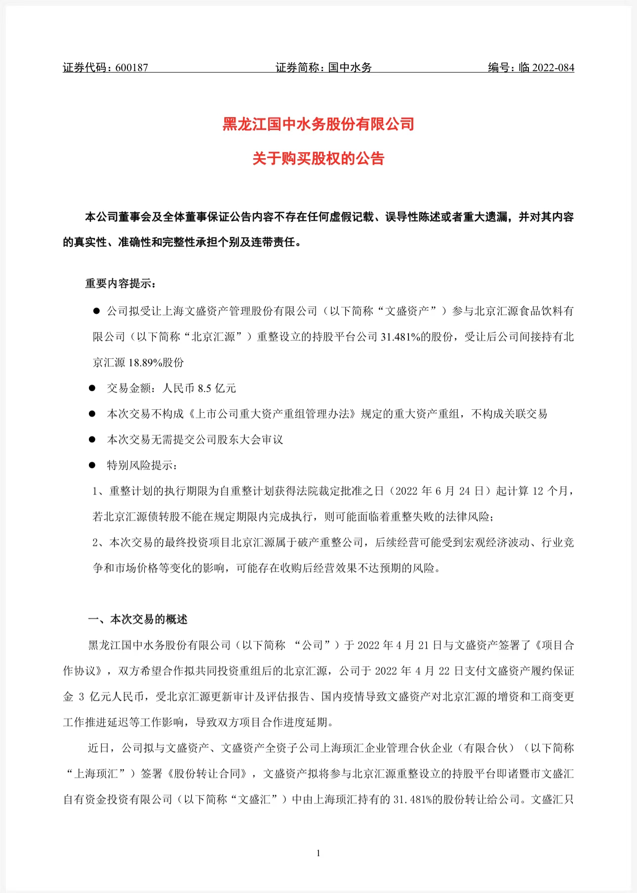 國中水務(wù)稱,近日,公司擬與文盛資產(chǎn)、文盛資產(chǎn)全資子公司上海頊匯企業(yè)管理合伙企業(yè)(有限合伙)(以下簡稱“上海頊匯”)簽署《股份轉(zhuǎn)讓合同》,文盛資產(chǎn)擬將參與北京匯源重整設(shè)立的持股平臺即諸暨市文盛匯自有資金投資有限公司(以下簡稱“文盛匯”)中由上海頊匯持有的31.481%的股份轉(zhuǎn)讓給公司。文盛匯只認(rèn)購重整后的北京匯源 60%股權(quán),不做其他經(jīng)營業(yè)務(wù),轉(zhuǎn)讓后公司間接持有北京匯源18.89%股份。