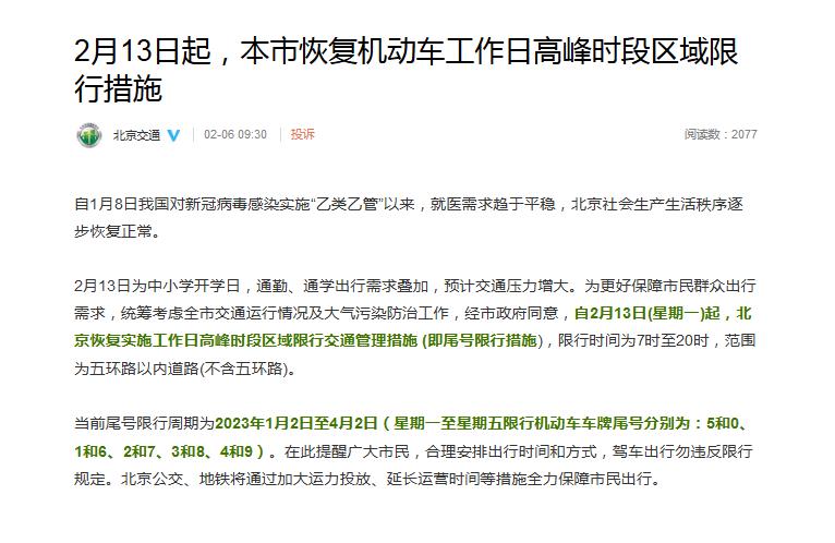 2月13日為中小學(xué)開(kāi)學(xué)日,通勤、通學(xué)出行需求疊加,預(yù)計(jì)交通壓力增大。為更好保障市民群眾出行需求,統(tǒng)籌考慮北京全市交通運(yùn)行情況及大氣污染防治工作,經(jīng)北京市政府同意,自2月13日(星期一)起,北京恢復(fù)實(shí)施工作日高峰時(shí)段區(qū)域限行交通管理措施(即尾號(hào)限行措施),限行時(shí)間為7時(shí)至20時(shí),范圍為五環(huán)路以內(nèi)道路(不含五環(huán)路)。
