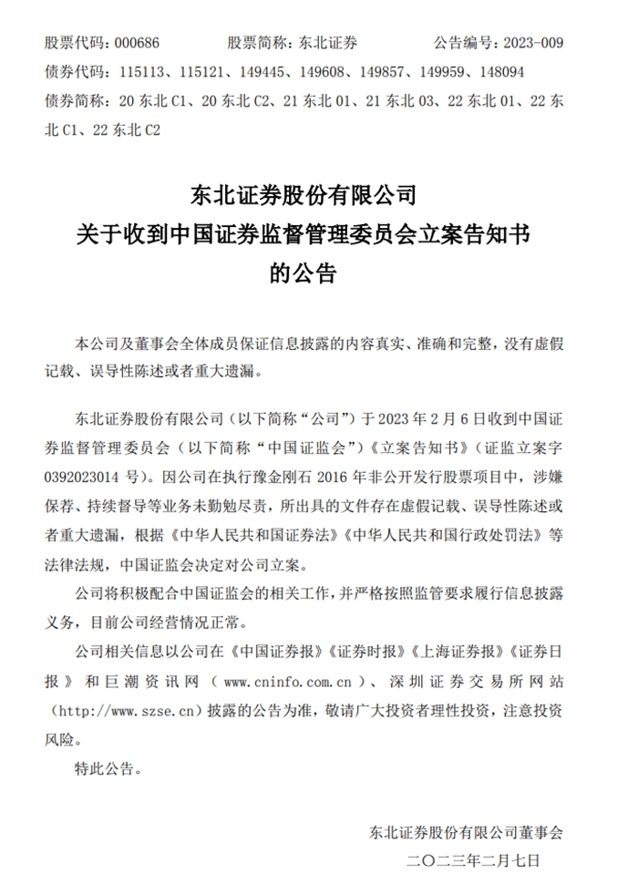 中新網(wǎng)2月7日電 7日,東北證券發(fā)公告稱,東北證券股份有限公司于2023年2月6日收到中國證券監(jiān)督管理委員會《立案告知書》(證監(jiān)立案字 0392023014 號)。因公司在執(zhí)行豫金剛石2016年非公開發(fā)行股票項目中,涉嫌保薦、持續(xù)督導等業(yè)務(wù)未勤勉盡責,所出具的文件存在虛假記載、誤導性陳述或者重大遺漏,根據(jù)相關(guān)法律法規(guī),中國證監(jiān)會決定對公司立案。(中新財經(jīng))