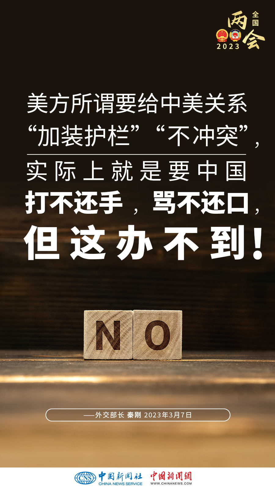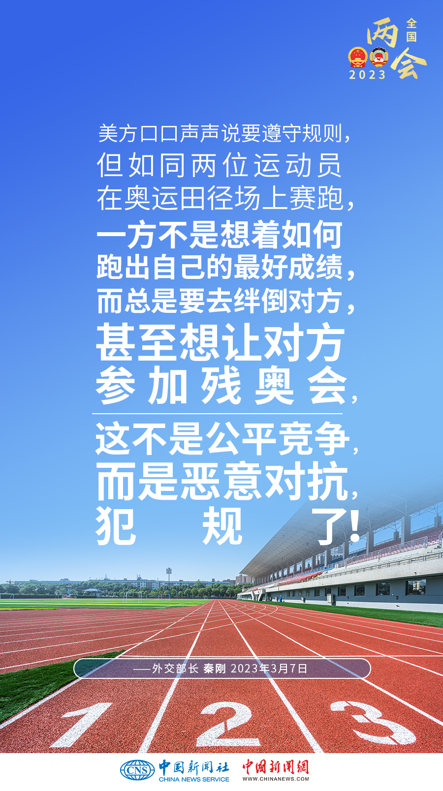 秦剛:美方聲稱要“競(jìng)贏”中國但不尋求沖突。但實(shí)際上,美方的所謂“競(jìng)爭(zhēng)”,就是全方位遏制打壓,就是你死我活的零和博弈。美方口口聲聲說要遵守規(guī)則,但如同兩位運(yùn)動(dòng)員在奧運(yùn)田徑場(chǎng)上賽跑,一方不是想著如何跑出自己的最好成績(jī),而總是要去絆倒對(duì)方,甚至想讓對(duì)方參加殘奧會(huì),這不是公平競(jìng)爭(zhēng),而是惡意對(duì)抗,犯規(guī)了!美方所謂要給中美關(guān)系“加裝護(hù)欄”“不沖突”,實(shí)際上就是要中國打不還手,罵不還口,但這辦不到!