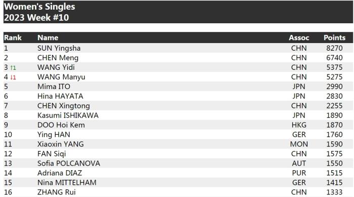 女單方面,孫穎莎以8270分領先,穩(wěn)居第一,陳夢6740分位居第二,王藝迪5375分位列第三,王曼昱排名第四。日本選手伊藤美誠以2990分排在第五位。