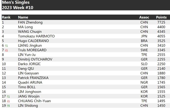 男單方面,樊振東繼續(xù)保持優(yōu)勢,以7725分排名第一,馬龍以4400分位列第二,王楚欽以4345分排名第三,梁靖崑3410分排名第六,較第9周排名上升一位。