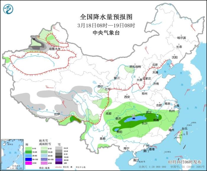 3月18日08時(shí)至19日08時(shí),新疆沿天山地區(qū)和西北部、西藏東部和南部、青海中部和南部等地部分地區(qū)有小到中雪或雨夾雪,其中,新疆沿天山地區(qū)等地局地有大雪(5~8毫米)。西藏東南部、貴州中部和東北部、重慶東南部、湖南中北部、湖北東南部、江西北部等地部分地區(qū)有中到大雨,局地暴雨(50~55毫米)。內(nèi)蒙古中部、黑龍江東北部、新疆北部、西藏中部等地部分地區(qū)有4~6級風(fēng)。臺(tái)灣海峽將有6~7級、陣風(fēng)8級的東北風(fēng)。
