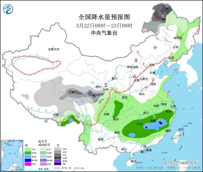 3月22日08時至23日08時,內(nèi)蒙古東北部、黑龍江西北部、西藏東部、西北地區(qū)中部等地的部分地區(qū)有小到中雪,其中,內(nèi)蒙古東北部、黑龍江西北部、青海南部等地的部分地區(qū)有大到暴雪(10~18毫米)。西藏東南部、江南中南部、貴州東南部、廣西東北部等地的部分地區(qū)有中到大雨,局部有暴雨(50~70毫米)。內(nèi)蒙古中東部、東北地區(qū)西部、華北等地的部分地區(qū)有4~6級風(fēng),其中,內(nèi)蒙古東北部等地部分地區(qū)有6~7級風(fēng)。