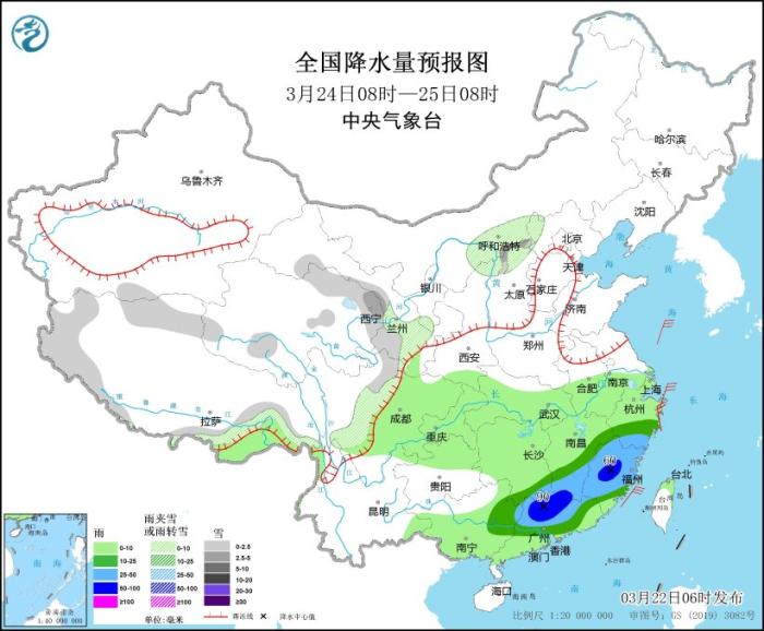 3月24日08時至25日08時,西藏西部、青海東部、甘肅南部、山西北部、川西高原北部等地的部分地區(qū)有小到中雪或雨夾雪。江南南部、華南中北部等地的部分地區(qū)有中到大雨,其中,江西南部、福建中部、廣東北部等地部分地區(qū)有暴雨(50~90毫米)。黃海大部海域?qū)⒂?~7級風(fēng)、陣風(fēng)8級,部分海域陣風(fēng)可達(dá)9級。
