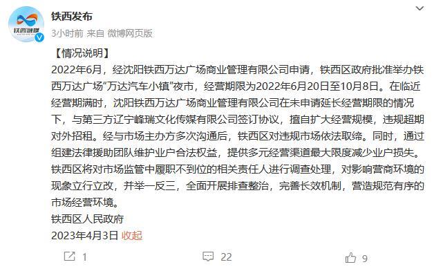 中新網(wǎng)4月3日電 鐵西發(fā)布官方微博3日發(fā)布情況說明:2022年6月,經(jīng)沈陽鐵西萬達(dá)廣場(chǎng)商業(yè)管理有限公司申請(qǐng),鐵西區(qū)政府批準(zhǔn)舉辦鐵西萬達(dá)廣場(chǎng)“萬達(dá)汽車小鎮(zhèn)”夜市,經(jīng)營期限為2022年6月20日至10月8日。在臨近經(jīng)營期滿時(shí),沈陽鐵西萬達(dá)廣場(chǎng)商業(yè)管理有限公司在未申請(qǐng)延長經(jīng)營期限的情況下,與第三方遼寧峰瑞文化傳媒有限公司簽訂協(xié)議,擅自擴(kuò)大經(jīng)營規(guī)模,違規(guī)超期對(duì)外招租。