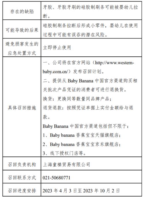中新網(wǎng)4月3日電 據(jù)“上海市場監(jiān)管”微信公眾號3日消息,上海童榛貿(mào)易有限公司自2023年4月3日至2023年10月2日召回2010年1月至2022年8月生產(chǎn)的香蕉寶寶牌硅膠嬰兒牙膠、玉米硅膠嬰兒牙膠牙刷,共計983897件。