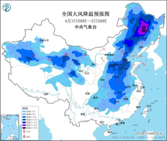 受較強(qiáng)冷空氣影響,4月3日08時(shí)至5日08時(shí),新疆南疆盆地、西北地區(qū)中部、內(nèi)蒙古西部和東北部、華北、東北地區(qū)、黃淮、江漢、江淮中西部、江南中西部等地氣溫將下降4~8℃,其中,內(nèi)蒙東北部、東北地區(qū)西部、華北南部等地局地降溫幅度可達(dá)10℃以上;上述部分地區(qū)并有5~6級(jí)偏北風(fēng),陣風(fēng)7~9級(jí)。新疆南部和東部、內(nèi)蒙古西部、甘肅西部等地有沙塵天氣(見圖1)。3日夜間,渤海、黃海西南部海域、東海西北部海域、長江口附近海域?qū)⒂?級(jí)、陣風(fēng)9級(jí)的大風(fēng),其中渤海灣將有9級(jí)、陣風(fēng)10級(jí)的大風(fēng)。中央氣象臺(tái)4月3日06時(shí)繼續(xù)發(fā)布大風(fēng)降溫預(yù)報(bào)和海上大風(fēng)黃色預(yù)警。