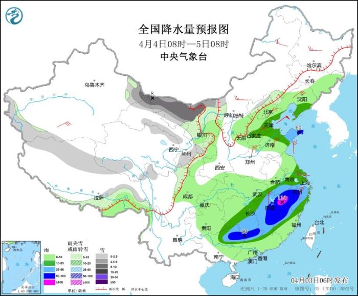 4月3日08時(shí)至4日08時(shí),新疆南疆盆地和東部、西藏東部、西北地區(qū)中部和東北部、內(nèi)蒙古中部、川西高原北部、陜西北部、山西北部、河北北部等地部分地區(qū)有小到中雪或雨夾雪,其中,內(nèi)蒙古中部、河北西北部等地部分地區(qū)有大到暴雪,局地大暴雪(20~22毫米)。湖北東部和南部、湖南北部、江西北部、安徽、河南東部、山東南部、江蘇及陜西中部、山西中部、重慶北部、廣西東北部等地有大到暴雨,其中,安徽西南部、湖北東部、湖南北部等地部分地區(qū)有大暴雨(100~130毫米)。內(nèi)蒙古、東北地區(qū)西部、新疆南部、華北、黃淮、江淮等地部分地區(qū)有4~6級(jí)風(fēng),局部有6~7級(jí)風(fēng)(見圖3)。渤海、黃海西南部、東海西北部、長江口附近海域?qū)⒂?級(jí)、陣風(fēng)9級(jí)的大風(fēng),其中渤海灣將有9級(jí)、陣風(fēng)10級(jí)的大風(fēng)。