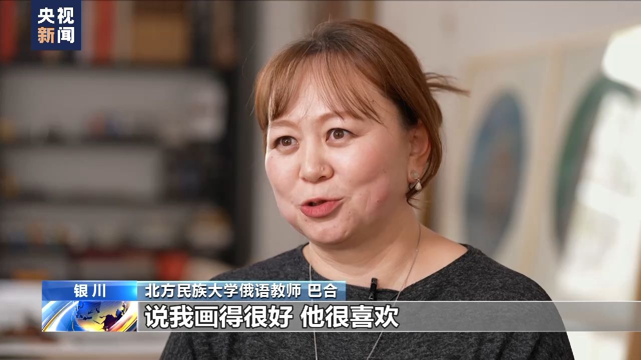 巴合是北方民族大學(xué)的一名俄語教師,在寧夏銀川已經(jīng)生活了13年。她的丈夫是在大學(xué)里擔(dān)任藝術(shù)教師的中國人。巴合說,初來中國時語言不通帶來的孤獨感,讓她選擇用繪畫排解鄉(xiāng)愁,也偶然間開啟了自己的藝術(shù)之旅。
