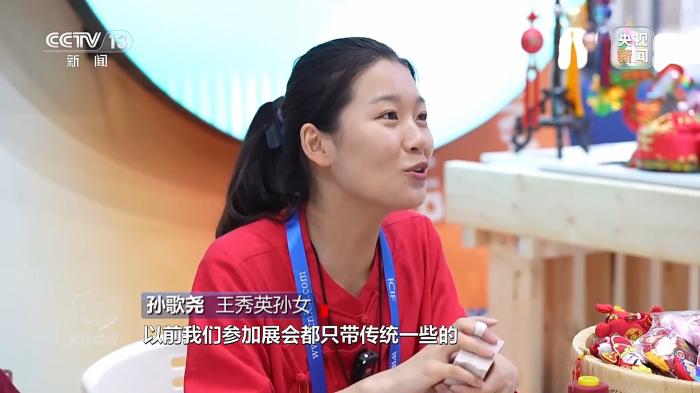 王秀英孫女孫歌堯:第一天人特別多,也有好多參展商們來我這邊參觀想合作,比如給我們一些logo,或者幫他定制一些香包。我們帶動馬莊村300多位村民一起做,1天產(chǎn)量能達(dá)到3000個,去年馬莊香包年產(chǎn)值800萬元。