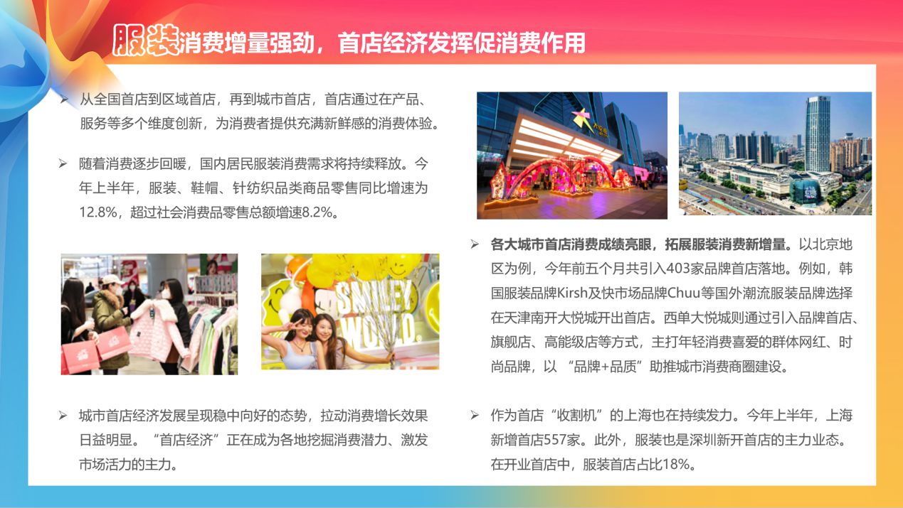 在服裝消費方面,隨著消費逐步回暖,國內(nèi)居民服裝消費需求將持續(xù)釋放。以北京地區(qū)為例,今年前五個月共引入403家品牌首店落地。例如,韓國服裝品牌Kirsh及快市場品牌Chuu等國外潮流服裝品牌選擇在天津南開大悅城開出首店。西單大悅城則通過引入品牌首店、旗艦店、高能級店等方式,主打年輕消費喜愛的群體網(wǎng)紅、時尚品牌,以“品牌+品質(zhì)”助推城市消費商圈建設(shè)?!秷蟾妗氛J為,“首店經(jīng)濟”正在成為各地挖掘消費潛力、激發(fā)市場活力的主力。