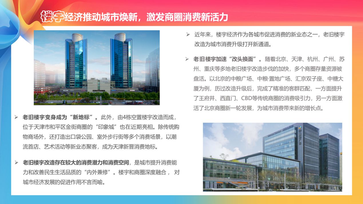 老舊樓宇改造存在較大的消費潛力和消費空間,是城市提升消費能力和改善民生生活品質(zhì)的“內(nèi)外兼修”?!秷蟾妗肥崂碇赋?,隨著北京、天津、杭州、廣州、蘇州、重慶等多地老舊樓宇改造步伐的加快,多個商圈存量資源被盤活。以北京的中糧廣場、中糧·置地廣場、匯京雙子座、中糖大廈為例,通過舊改提升、輕(中)資產(chǎn)輸出等方式,打造高端商務(wù)地標,完成了精準的客群匹配,一方面提升了王府井、西直門、CBD等傳統(tǒng)商圈的消費吸引力,另一方面激活了北京商圈新一輪發(fā)展,推動片區(qū)重構(gòu)和能級提升,為城市消費帶來新的增長點。