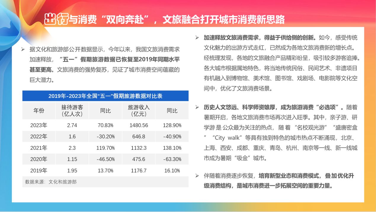 在出行方面,感受傳統(tǒng)文化魅力的出游方式走紅,已然成為各地文旅消費新的增長點。隨著暑期開啟,各地文旅消費市場再次進入旺季。其中,親子游、研學(xué)游是公眾最為關(guān)注的熱點。伴隨著消費逐步恢復(fù),培育新型業(yè)態(tài)和消費模式,疊加優(yōu)化升級消費結(jié)構(gòu),是城市消費進一步拓展空間的重要力量。