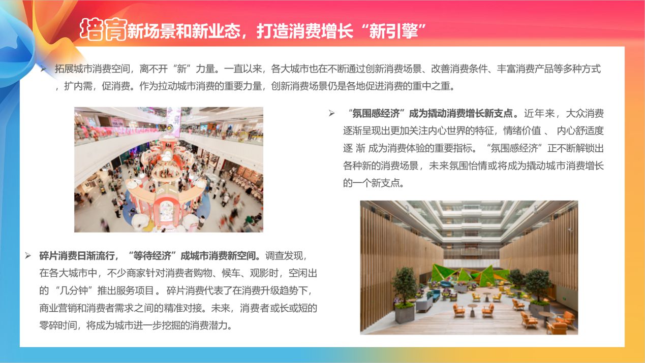《報告》表示,拓展城市消費空間,離不開“新”力量。一直以來,各大城市也在不斷通過創(chuàng)新消費場景、改善消費條件、豐富消費產(chǎn)品等多種方式,擴內(nèi)需,促消費。作為拉動城市消費的重要力量,創(chuàng)新消費場景仍是各地促進消費的重中之重。