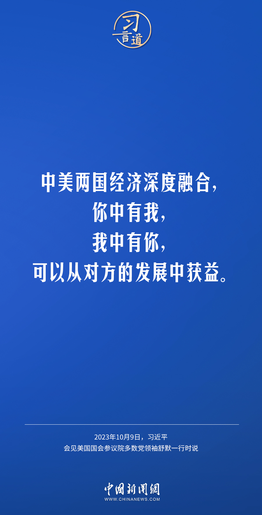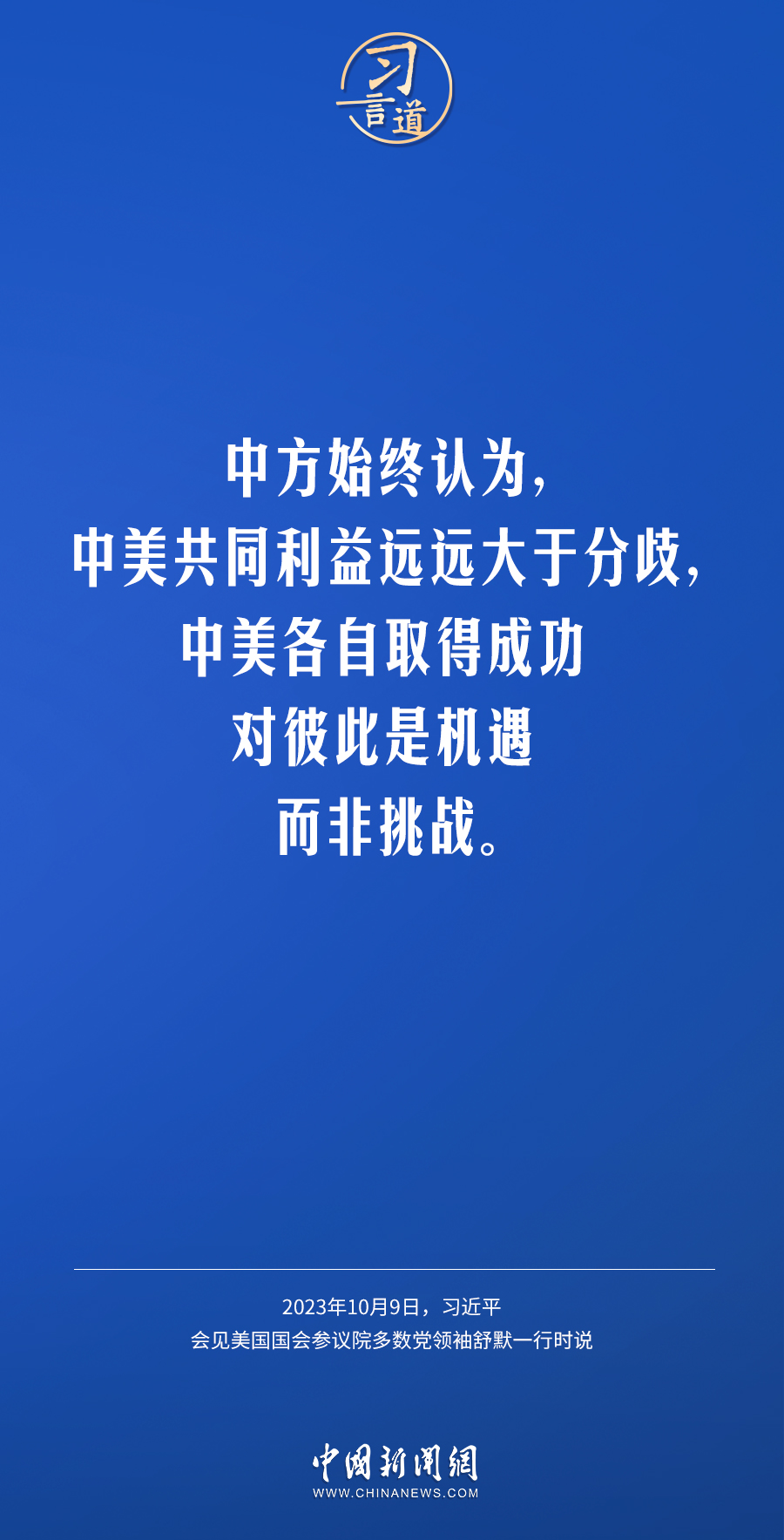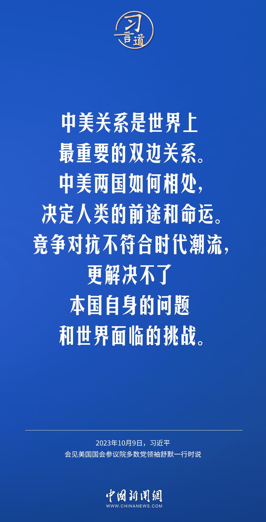 10月9日下午,國家主席習近平在人民大會堂會見美國國會參議院多數(shù)黨領袖舒默率領的美國國會參議院兩黨代表團。習近平指出——