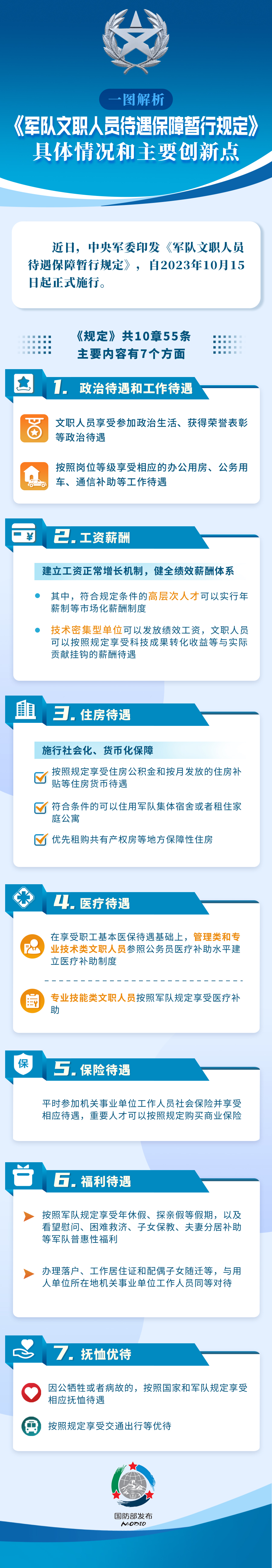 六是福利待遇。按照軍隊規(guī)定享受年休假、探親假等假期,以及看望慰問、困難救濟、子女保教、夫妻分居補助等軍隊普惠性福利。辦理落戶、工作居住證和配偶子女隨遷等,與用人單位所在地機關事業(yè)單位工作人員同等對待。