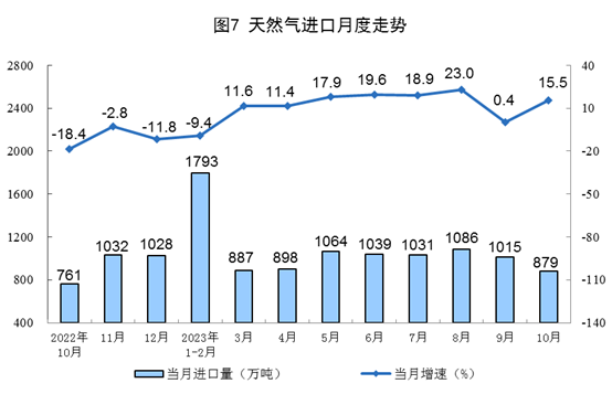 1—10月份,生產(chǎn)天然氣1896億立方米,同比增長(zhǎng)6.1%。進(jìn)口天然氣9651萬(wàn)噸,同比增長(zhǎng)8.8%。