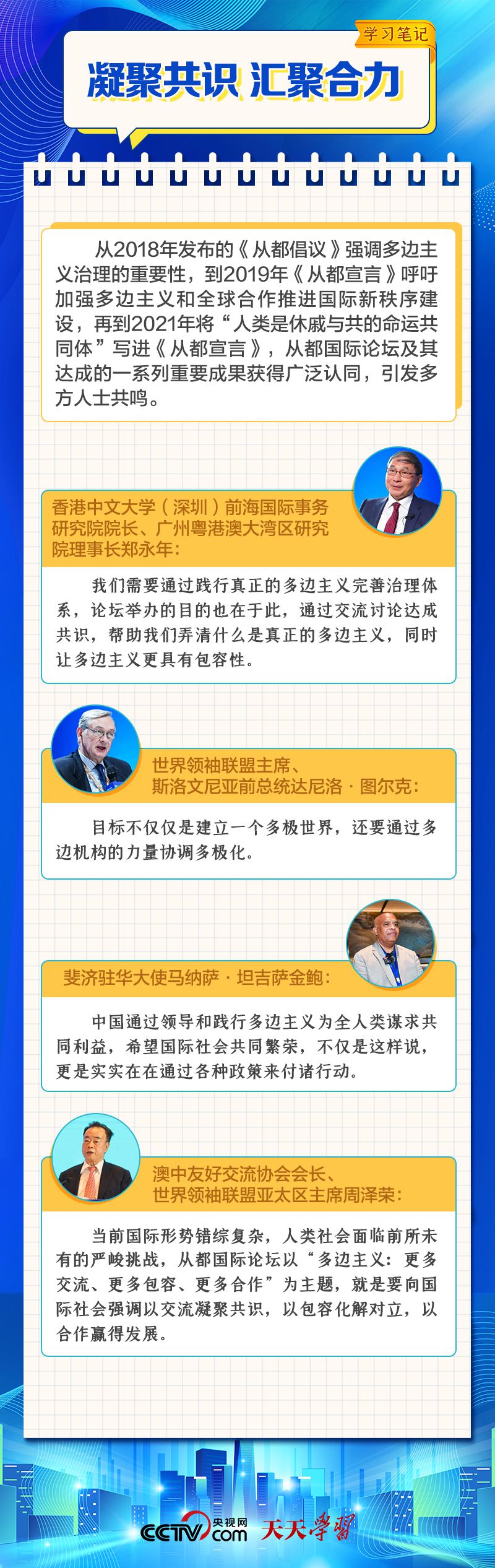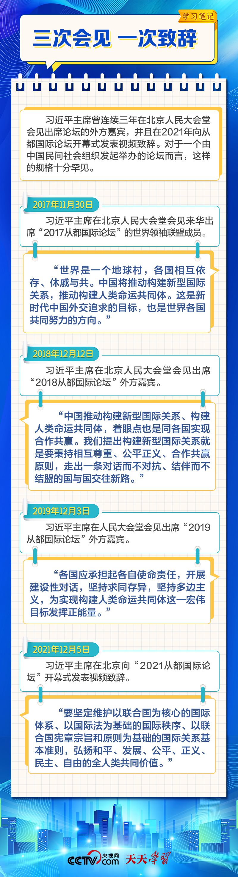 天天學(xué)習(xí) 12月4日,習(xí)近平主席在致“2023從都國際論壇”的賀信中強(qiáng)調(diào),面對前所未有的世界之變、時(shí)代之變和歷史之變,人類社會必須團(tuán)結(jié)起來,堅(jiān)持互學(xué)互鑒、開放包容、合作共贏,弘揚(yáng)全人類共同價(jià)值,共同建設(shè)更加美好的世界。