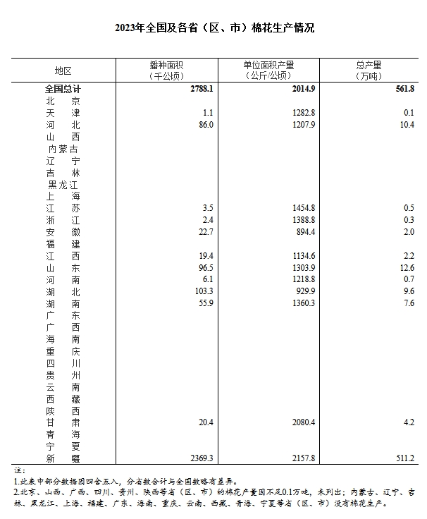 國(guó)家統(tǒng)計(jì)局:2023年全國(guó)棉花總產(chǎn)量561.8萬(wàn)噸
