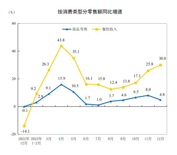 按消費(fèi)類型分,12月份,商品零售38145億元,同比增長(zhǎng)4.8%;餐飲收入5405億元,增長(zhǎng)30.0%。2023年,商品零售418605億元,比上年增長(zhǎng)5.8%;餐飲收入52890億元,增長(zhǎng)20.4%。