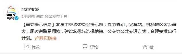 北京市交通委:春節(jié)假期火車(chē)站周邊易擁堵,建議優(yōu)先選擇公共交通
