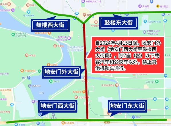 為確保全國重點文物保護單位“大運河——玉河故道(澄清上閘含萬寧橋)”的文物安全與交通安全,根據(jù)文物保護和道路交通安全有關法律法規(guī)規(guī)定,決定自2024年4月15日起,地安門外大街(地安門西大街至鼓樓西大街段),除7座(含)以下載客汽車和公交車以外,禁止其他機動車通行。