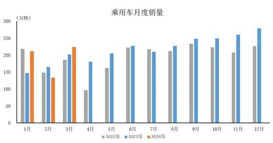 2024年3月,乘用車產(chǎn)銷分別完成225萬(wàn)輛和223.6萬(wàn)輛,環(huán)比分別增長(zhǎng)76.7%和67.8%,同比分別增長(zhǎng)4.7%和10.9%。