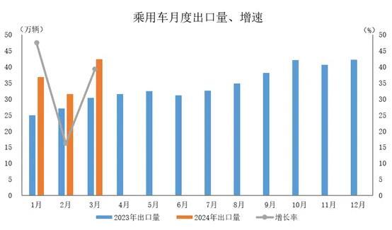 2024年3月,乘用車出口42.4萬(wàn)輛,環(huán)比增長(zhǎng)34.6%,同比增長(zhǎng)39.3%。