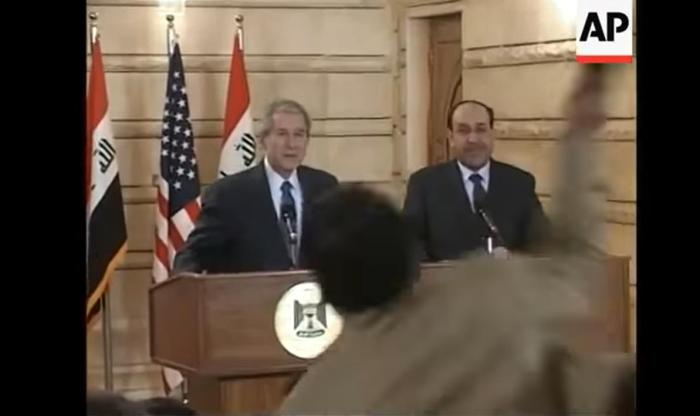 2008年12月,時(shí)任美國(guó)總統(tǒng)小布什在伊拉克首都巴格達(dá)的新聞發(fā)布會(huì)上,被伊拉克記者蒙塔達(dá)爾·扎伊迪扔鞋。圖片來源:美聯(lián)社視頻截圖