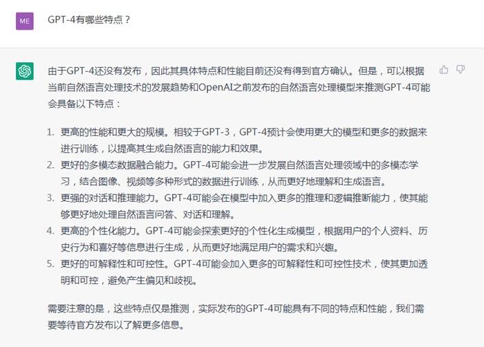 ChatGPT回答GPT-4有哪些特點。截圖