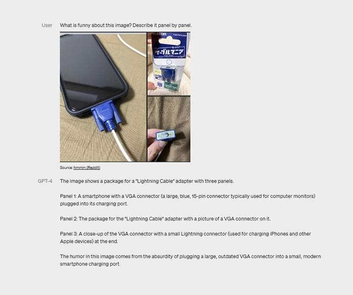 不過據(jù)OpenAI介紹,在輸入一張畫有VGA線連接手機充電接口內(nèi)容的圖像后,GPT-4除了能描述出這幅圖中的內(nèi)容,還能指出這張圖有哪些不對勁,“這幅圖中的幽默來自于將一個大的過時的VGA連接器插入一個小的現(xiàn)代化的智能手機充電端口。”