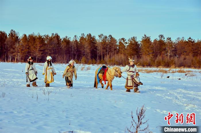 “傻嘟嘟”團隊身穿鄂倫春民族服飾在雪地拍攝 黑龍江省塔河縣文旅局供圖