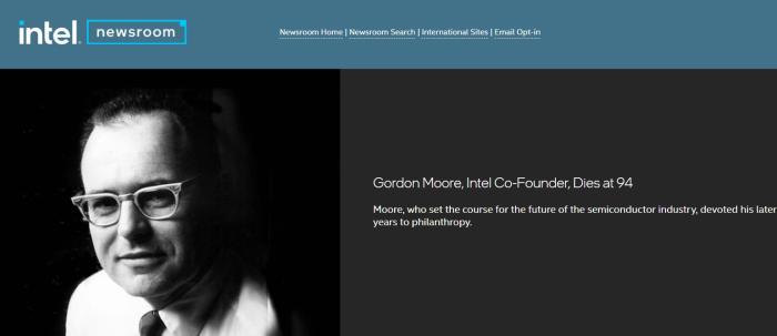 英特爾官網(wǎng)發(fā)布的戈登·摩爾去世的消息。圖片來源:英特爾官網(wǎng)截圖