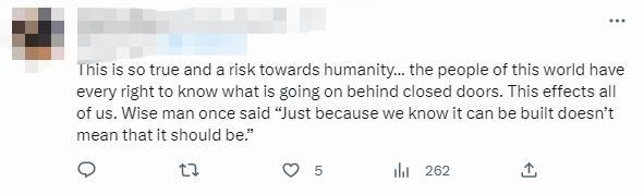 在網絡上,這封信也引起熱烈討論,有網友表示認同,人們需要知道發(fā)生了什么,“僅僅因為我們知道可以建造它,并不意味著應該建造”。
