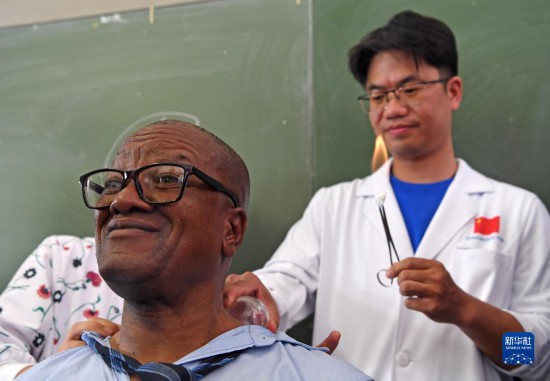 4月3日,在納米比亞溫得和克的伊曼紐爾·謝菲迪中學課堂上,校長卡奇翁瓜體驗拔火罐。新華社發(fā)(穆薩·卡薩克攝)