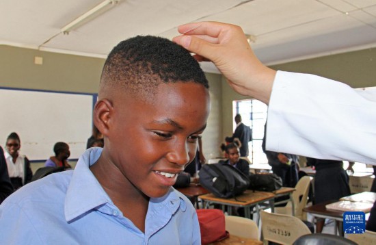 4月3日,在納米比亞溫得和克的伊曼紐爾·謝菲迪中學課堂上,一名學生體驗艾灸。新華社發(fā)(穆薩·卡薩克攝)