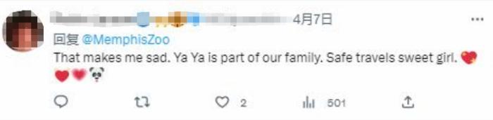 還有不少不能到現場的“丫丫”粉絲,在孟菲斯動物園社交媒體賬號下留言,用暖心的話語和“丫丫”說再見。