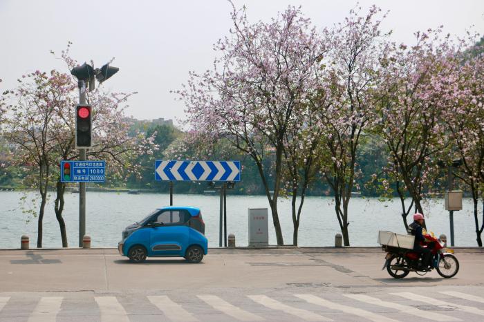 4月7日,廣西柳州市洋紫荊盛放,車(chē)輛在花海里穿梭。中新社記者 林馨 攝