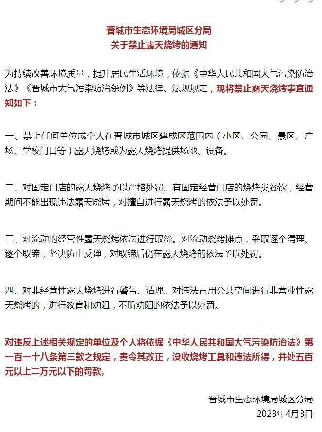中新網(wǎng)4月10日電 據(jù)山西省晉城市生態(tài)環(huán)境局微信公眾號消息,晉城市生態(tài)環(huán)境局城區(qū)分局10日發(fā)布關于禁止露天燒烤的通知。通知要求: