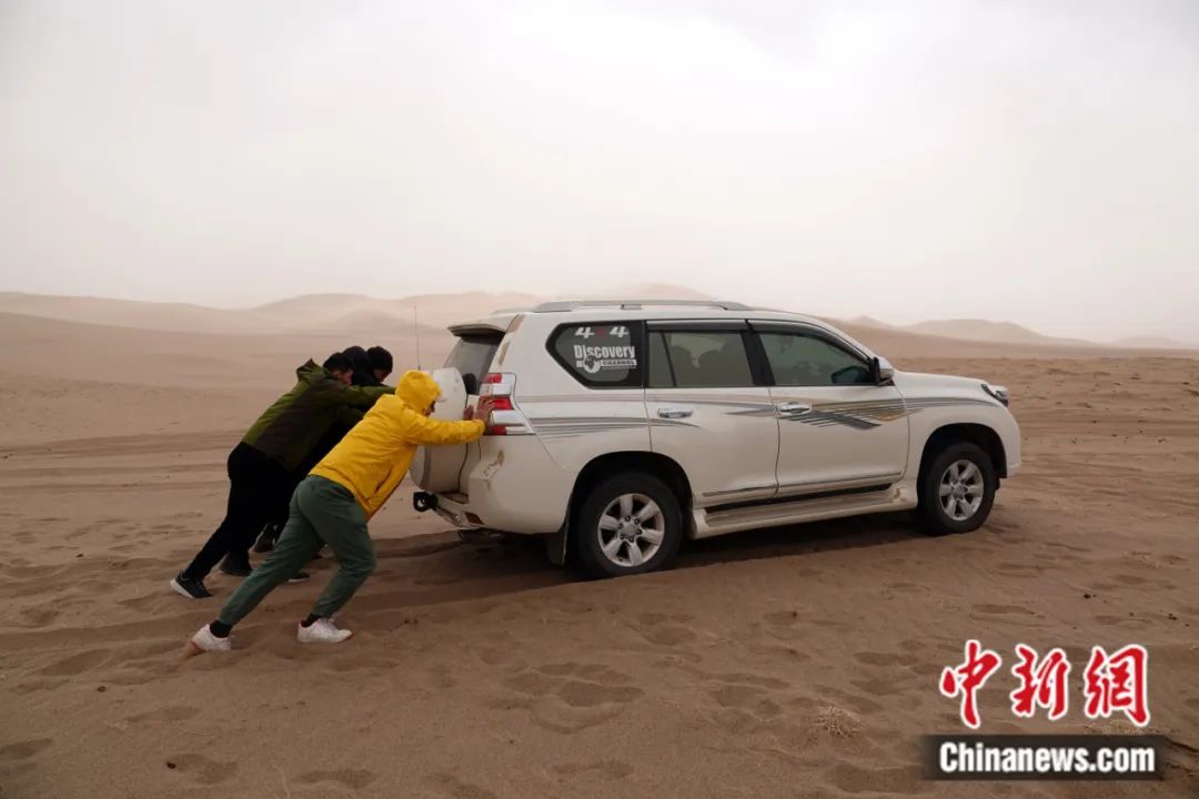 2023年4月,第三次新疆科考阿爾金山野外科考隊(duì)一行,前往阿爾金山國(guó)家級(jí)自然保護(hù)區(qū)庫(kù)木庫(kù)里沙漠的沙子泉考察調(diào)研,遭遇強(qiáng)沙塵暴天氣,科考隊(duì)員推車。孫自法 攝
