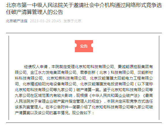 經(jīng)債權(quán)人申請(qǐng),北京市第一中級(jí)人民法院裁定受理北京知旬科技有限公司、秉誠(chéng)能源控股集團(tuán)有限公司、金江水力發(fā)電集團(tuán)有限公司、君泰創(chuàng)新(北京)科技有限公司、漢能新材料科技有限公司、北京知乘科技有限公司、北京漢能薄膜太陽(yáng)能電力工程有限公司、北京精誠(chéng)鉑陽(yáng)光電設(shè)備有限公司、北京漢能薄膜發(fā)電投資有限公司破產(chǎn)清算一案。