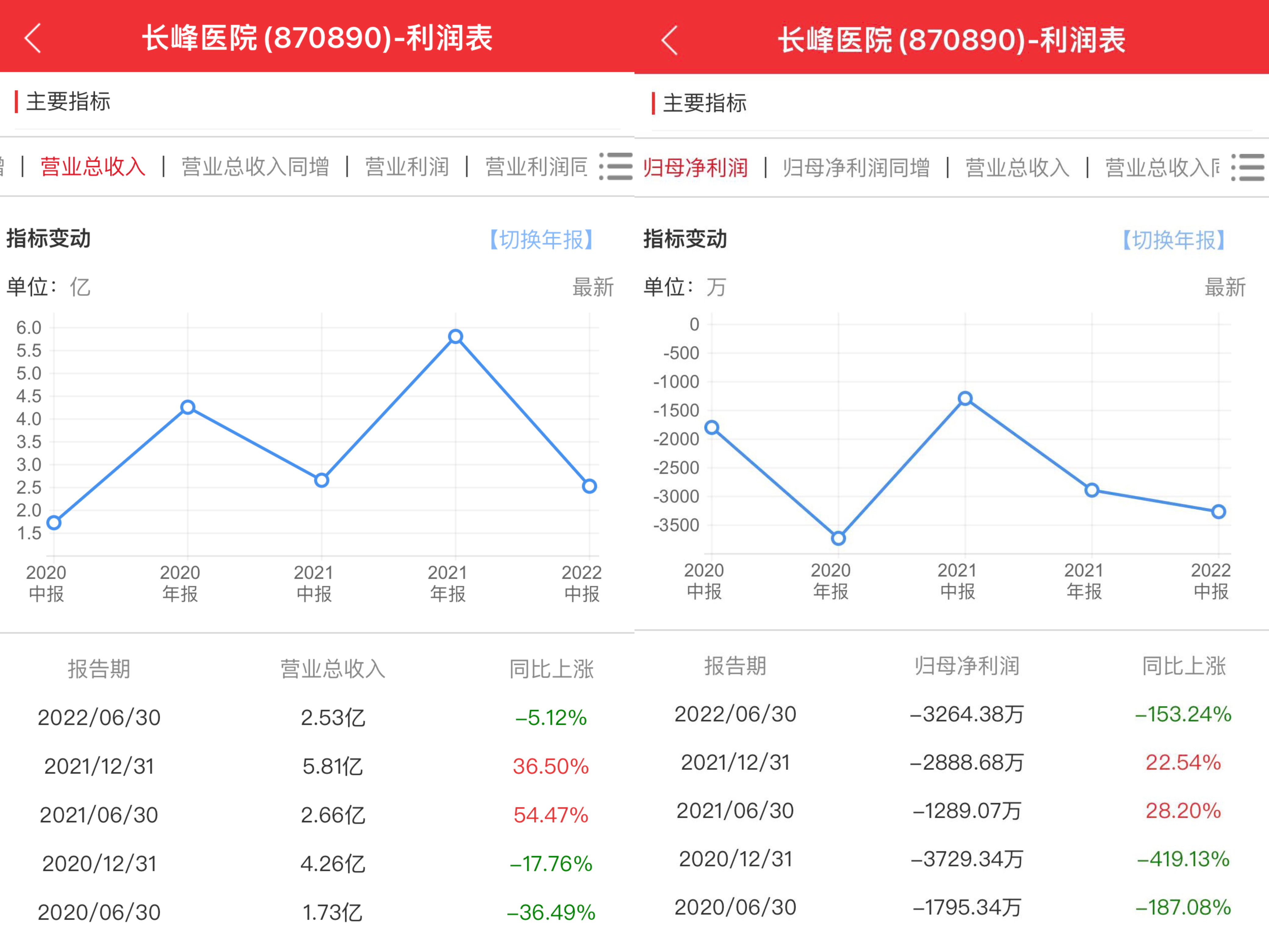 但其實,目前長峰醫(yī)院的經(jīng)營情況不容樂觀。自2019年起,長峰醫(yī)院經(jīng)營便出現(xiàn)了異常,并自2020年起陷入持續(xù)虧損。2020年長峰醫(yī)院歸母凈虧損為3729.34萬元,2021年雖實現(xiàn)了營收的回升,但報告期內(nèi)歸母凈虧損仍為2888.68萬元。