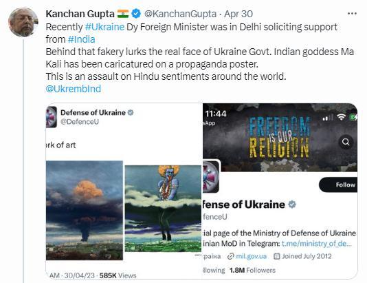 據(jù)俄新社報(bào)道,印度信息和廣播部高級(jí)顧問古普塔也對(duì)此表達(dá)了強(qiáng)烈的不滿,他在推特上轉(zhuǎn)發(fā)這一截圖,并寫道,“最近烏克蘭副外長(zhǎng)曾在新德里請(qǐng)求印度支持。這張偽造圖背后隱藏著烏克蘭政府的真實(shí)面目。印度教女神卡莉被諷刺地畫在一張宣傳海報(bào)上。這是對(duì)全世界印度教徒感情的攻擊”。