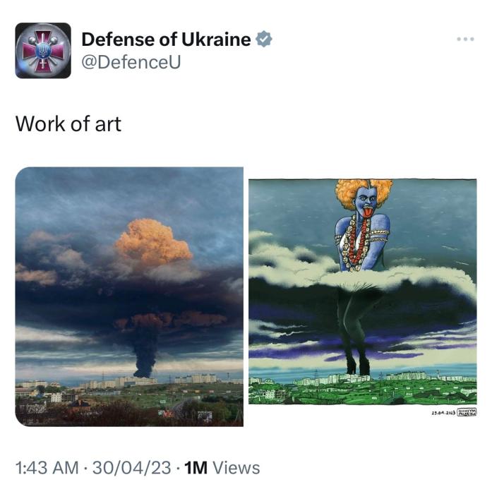 據(jù)俄新社、《印度斯坦時(shí)報(bào)》等多家媒體描述,烏國(guó)防部4月30日發(fā)布的這條推文中包含兩張圖片,第一張描繪了塞瓦斯托波爾灣一油庫(kù)遭無人機(jī)襲擊后升起的煙柱;另一張則是以第一張為基礎(chǔ)創(chuàng)作的漫畫,爆炸的濃煙中多了一名女性形象,她擺出與瑪麗蓮·夢(mèng)露掩住裙擺相似的姿勢(shì),而這一女性形象本身又與印度教女神卡莉相似。烏克蘭國(guó)防部對(duì)圖片的描述是“藝術(shù)作品(work of art)”。